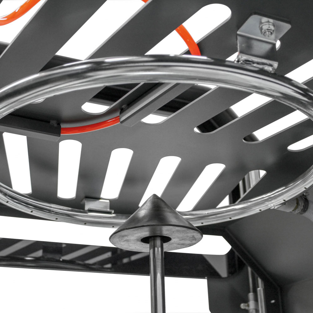 Fyllestasjonen er utstyrt med en kraftig sikkerhetsportal med innsyn i polykarbonat, som gir god visuell kontroll under dekkfylling samtidig som operatøren er beskyttet. Dette er spesielt viktig ved fylling av større hjul og dekk der energimengden kan være betydelig.