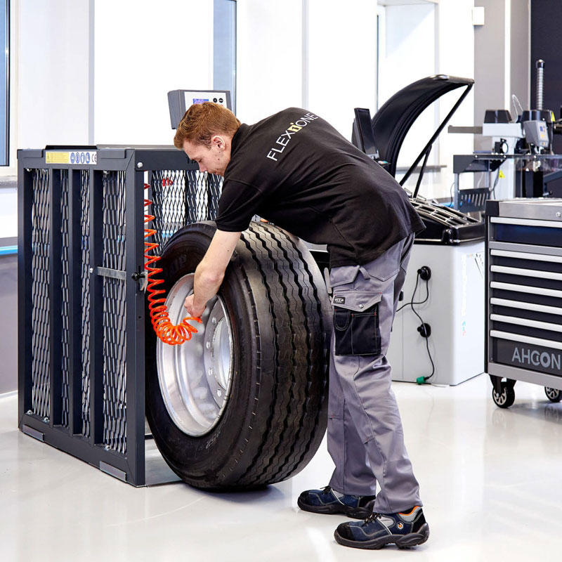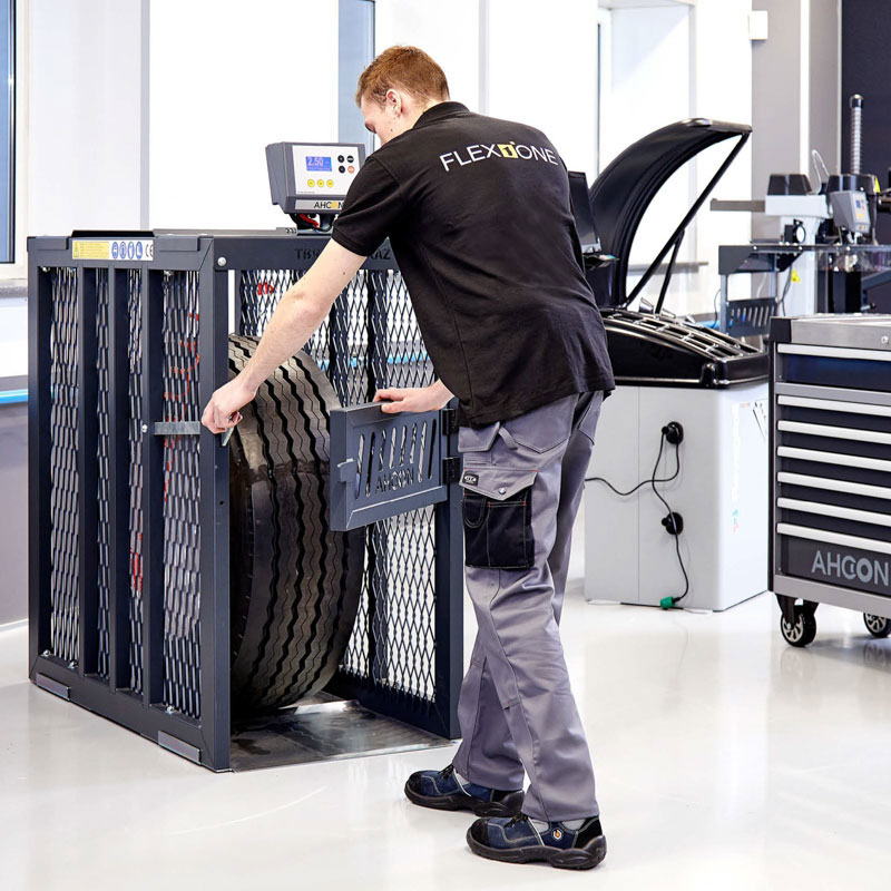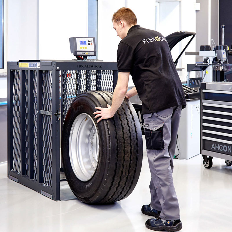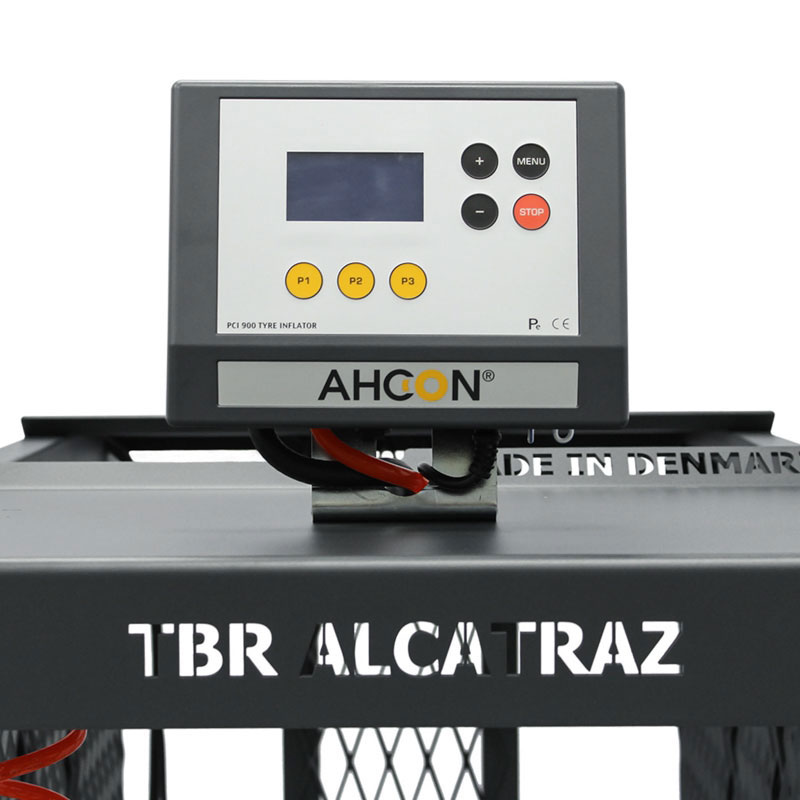 AHCON TBR Alcatraz Sikkerhetspumpebur Plus 1.0 er konstruert for sikker og kontrollert dekkfylling av lastebil-, buss- og anleggshjul. Ved eventuell dekksprengning under fylling beskytter burets solide stålkonstruksjon operatøren og verkstedet mot farlige splinter og trykkbølger, noe som gir et betydelig bedre HMS-nivå.