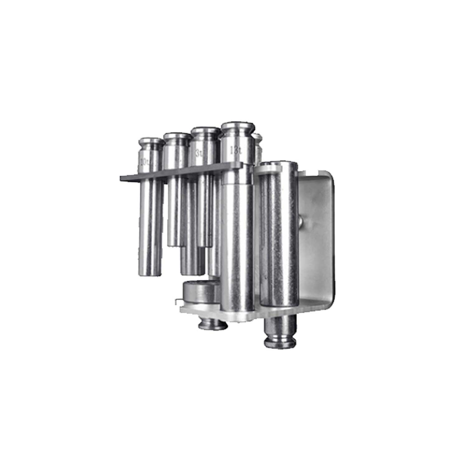 Pinssett med holder for verkstedpresse – pinner i 2–15 tonn, monteres direkte på presserammen for rask tilgang og trygg understøtting. Passer bl.a. SP-15ELM, SP-20E/EM, SP-30EM/EAM, SP-50EM/EAM, SP-100EAM.
